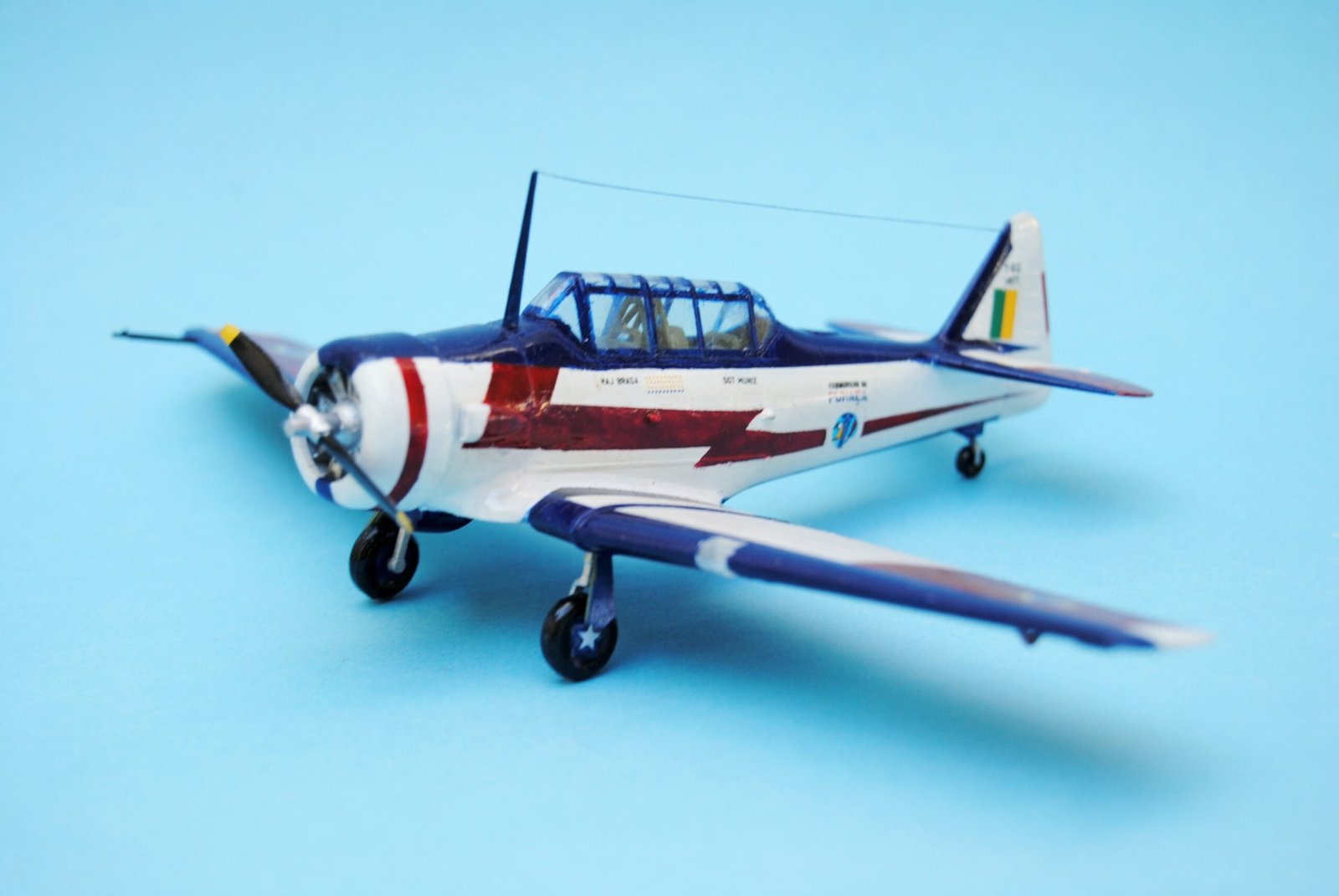 Muitos amigos modelistas refazem o trabalho, tiram as tintas, aplicam massa e praticamente montam outro modelo. Não acho legal. Esse kit faz parte de minha história modelística e mostra a minha evolução durante esses anos. Este não é o primeiro kit que montei, mas foi um dos cinco primeiros: um T-6 da Esquadrilha da Fumaça, na escala 1/72.