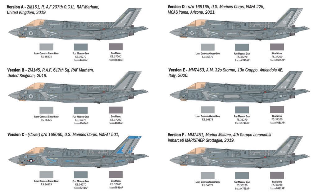The F-35 is known for its complex paint scheme with shades of gray and RAM (Radar Absorbent Material) panels. The kit offers:
