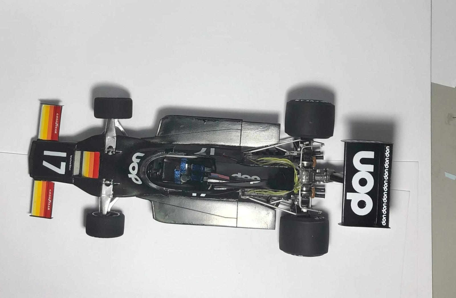 Fotos do modelo pronto do F-1 dos anos 70. Feito em resina, com partes de plastico, metal. Super detalhado, recomendo para completar a sua coleção de F-1.